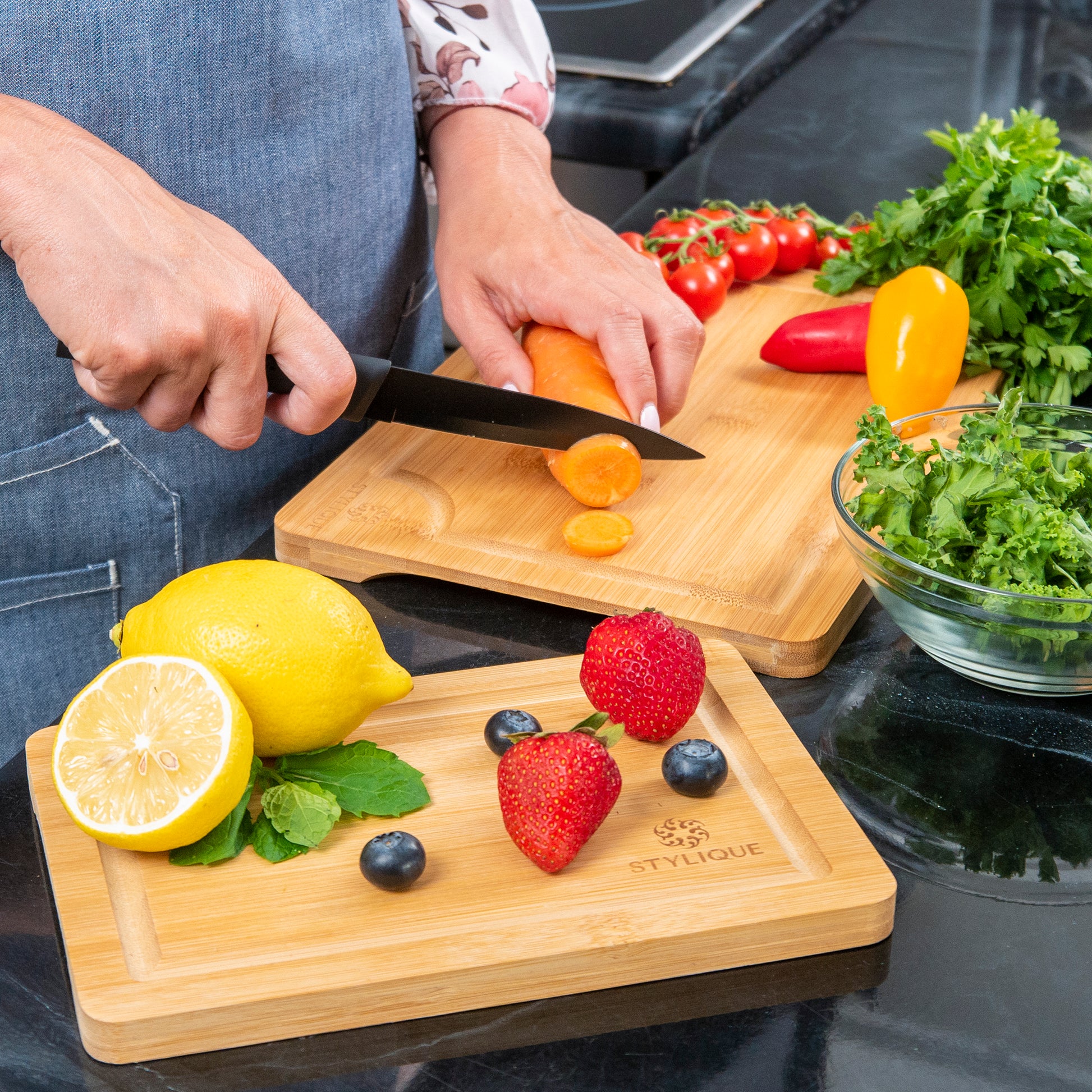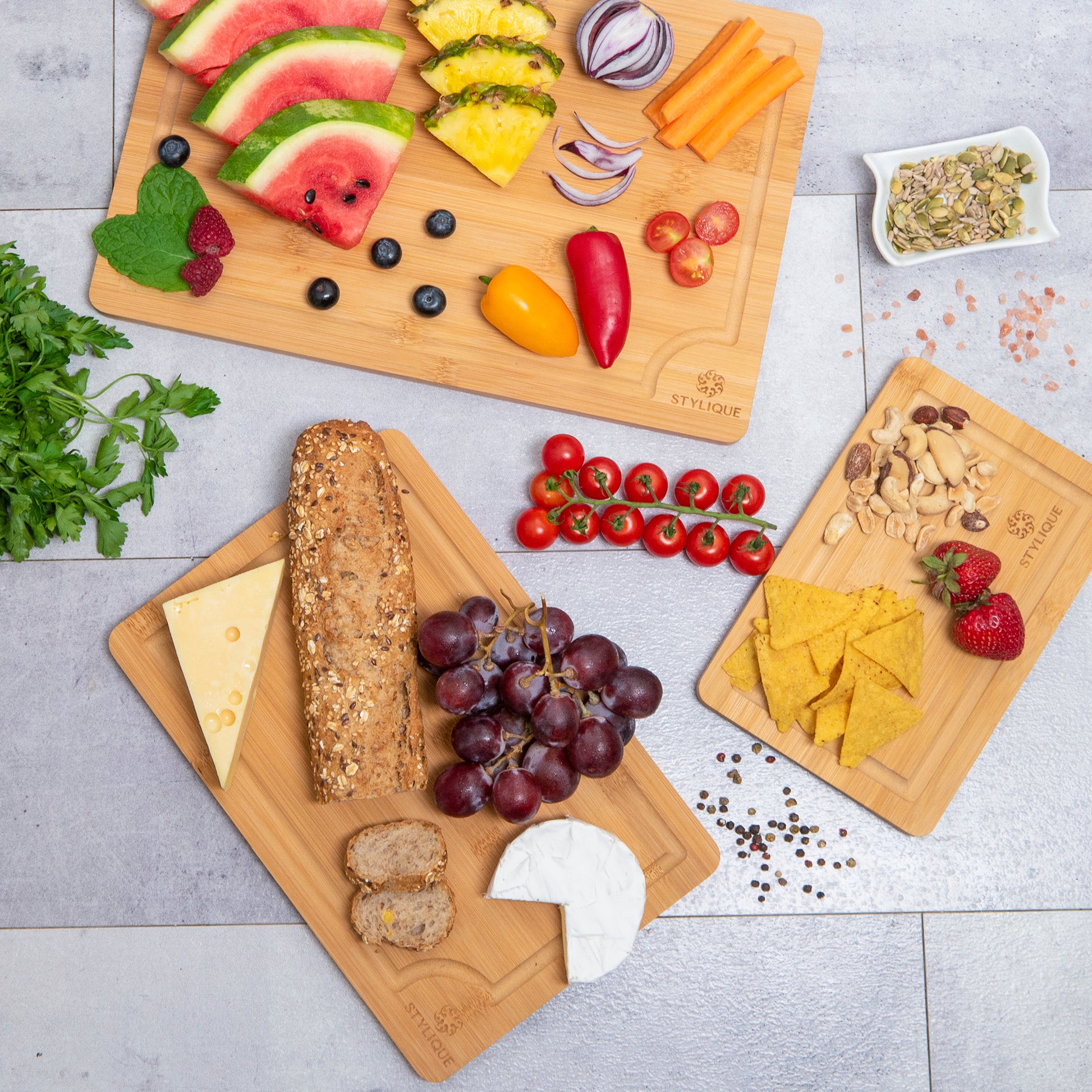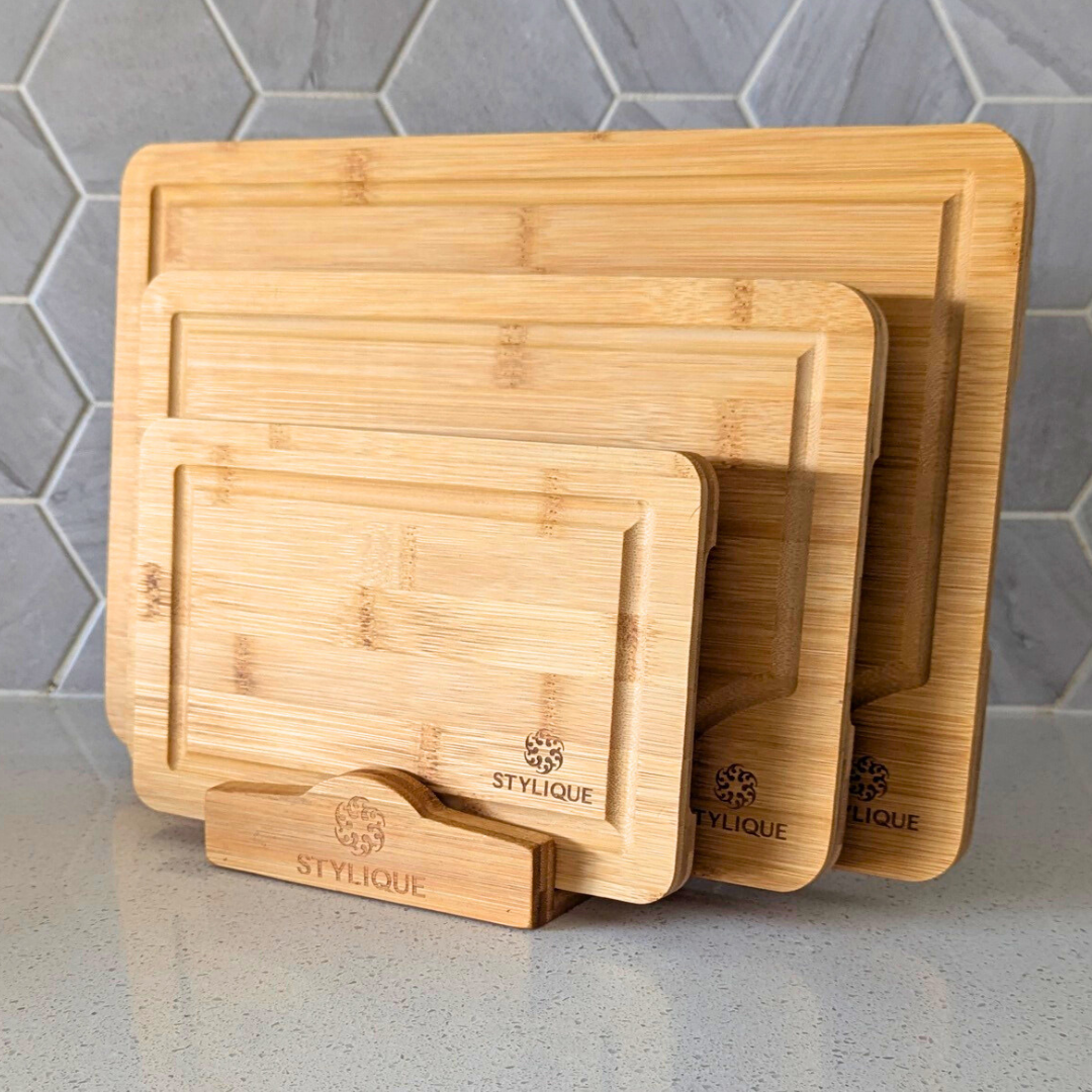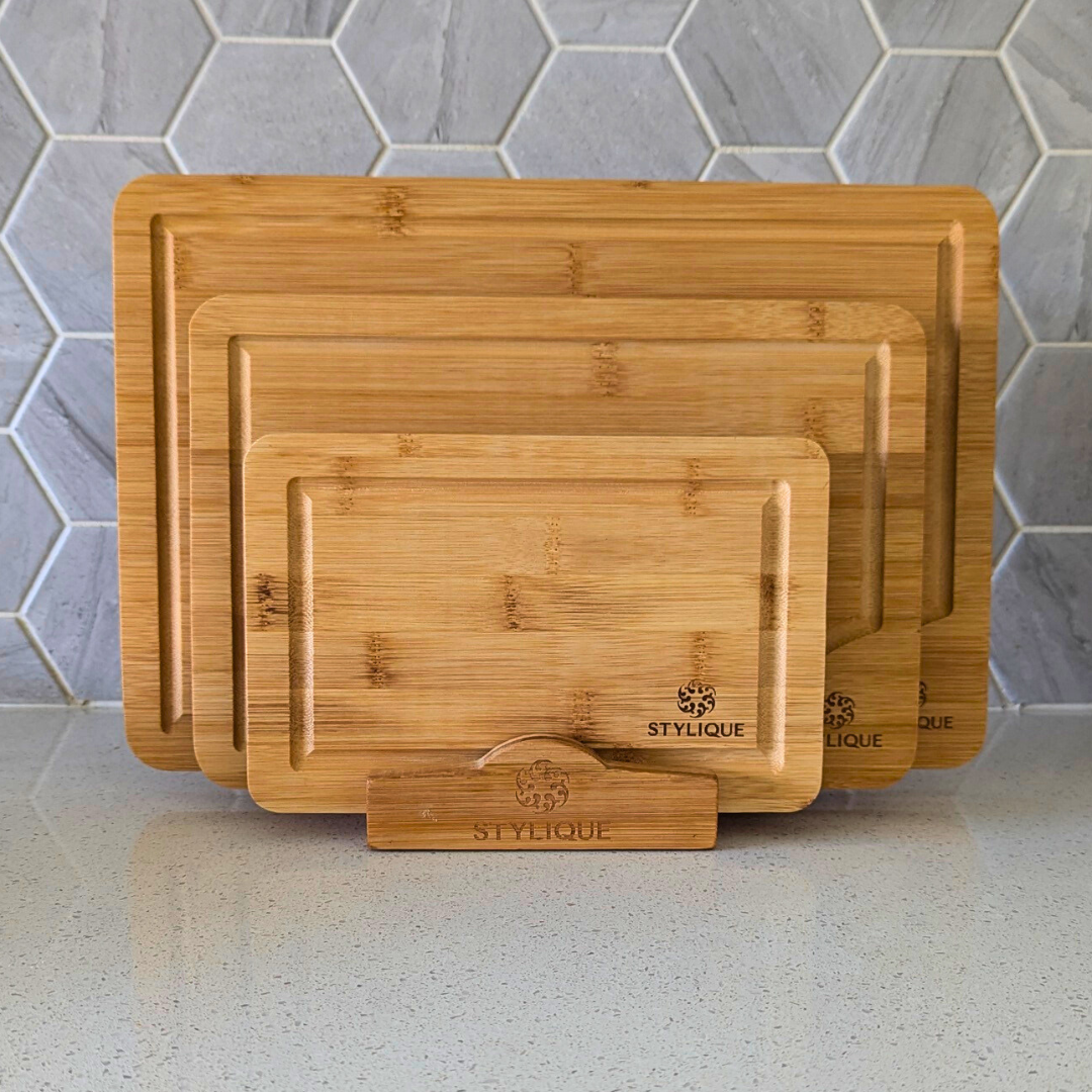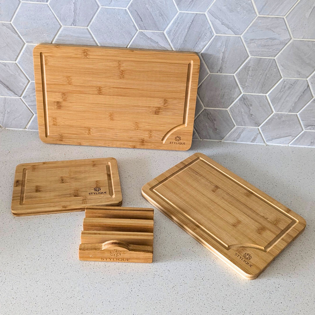 Why invest in the STYLIQUE Bamboo Chopping Board Set? It not only meets the demands of your cooking and serving needs but also adds a touch of elegance to your kitchen decor. Perfect for personal use or as a thoughtful gift, these boards enhance meal prep and make for an inviting presentation. Choose the size set that best fits your lifestyle and enjoy a blend of style, function, and sustainability.